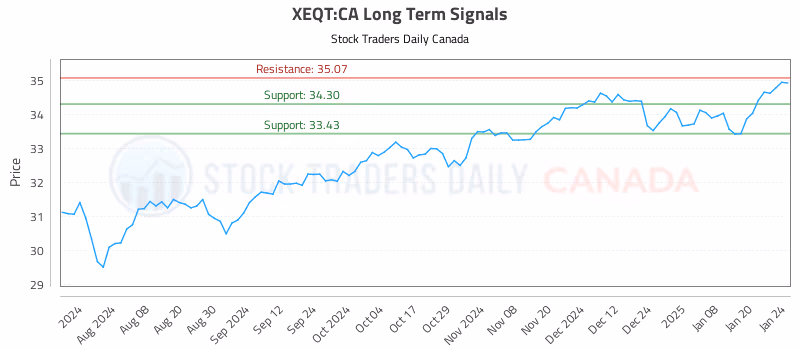 Generated by Stock Traders Daily's dynamic AI system, this trading report analyzes iShares Core Equity ETF Portfolio (TSX: XEQT) to uncover optimal trading strategies. With over 20 years of AI refinement, the report covers individual stocks, indices, ETFs, options, and futures. The aim is to enhance trading performance for iShares Core Equity ETF Portfolio while incorporating effective risk management techniques. Please note that this is a static report; support and resistance levels are subject to change and should be updated regularly. Subscribers receive real-time updates, in-depth market analysis, correlation tools, macroeconomic insights, timing tools, and Evitar Corte crash protection. Instructions: Utilize technical analysis to identify strategic buy and sell points. Buy signals are triggered when XEQT approaches support levels, while resistance levels indicate potential selling or risk management actions. Comprehensive trading plans for Day Trading, Swing Trading, and Long-Term Investing are provided below the Summary Table.